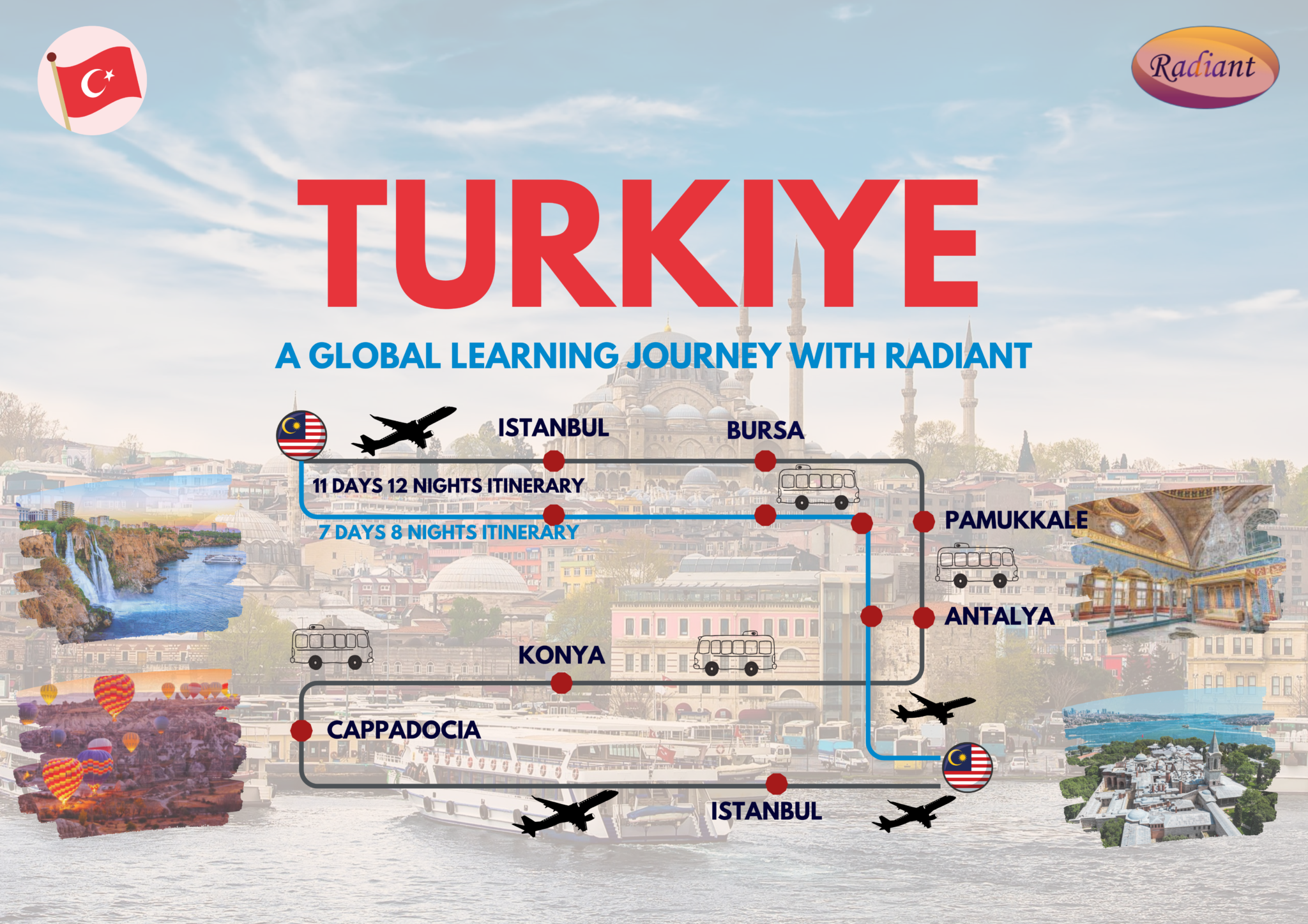 Embark on an unforgettable educational adventure with Radiant to Türkiye! Choose between two meticulously crafted itineraries: an immersive 11-day 12-night tour or a delightful 7-day 8-night tour. Explore the vibrant streets of Istanbul, the historic sites of Bursa, the natural wonders of Pamukkale, the stunning beaches of Antalya, the mystical landscapes of Cappadocia, and the cultural heart of Konya. Join us as we delve deep into Türkiye’s rich history, culture and breathtaking landscapes!