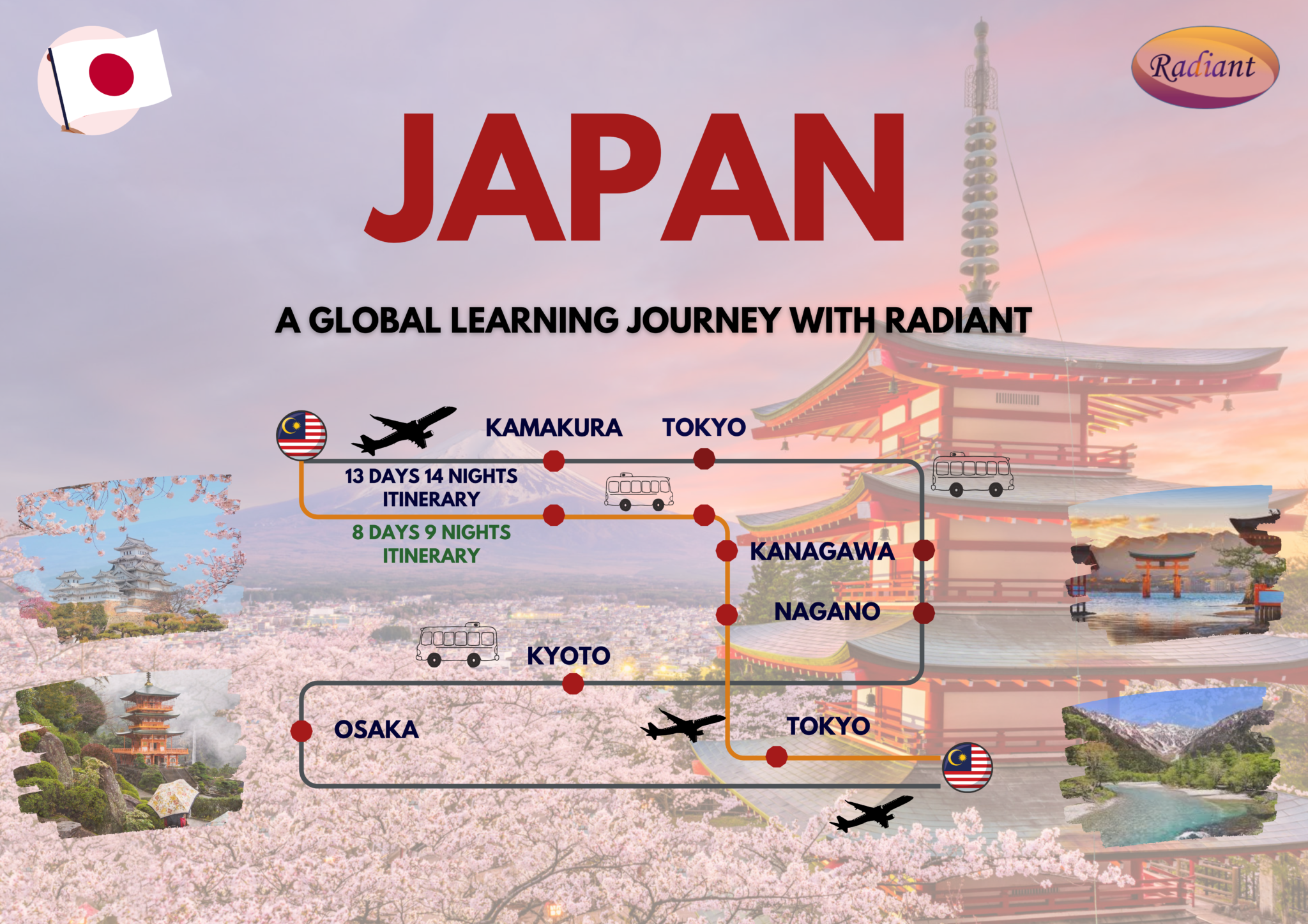 Embark on an unforgettable educational adventure with Radiant to Japan! Choose between two thoughtfully designed itineraries: an immersive 13-day 14-night journey or a compact 8-day 9-night experience. Explore the vibrant city of Tokyo, discover the historic charm of Kamakura and Kyoto, experience the dynamic energy of Osaka, and take in the scenic beauty of Kanagawa and Nagano. Join us as we dive into Japan’s rich culture, timeless traditions, advanced innovation, and breathtaking landscapes in one inspiring global learning journey.