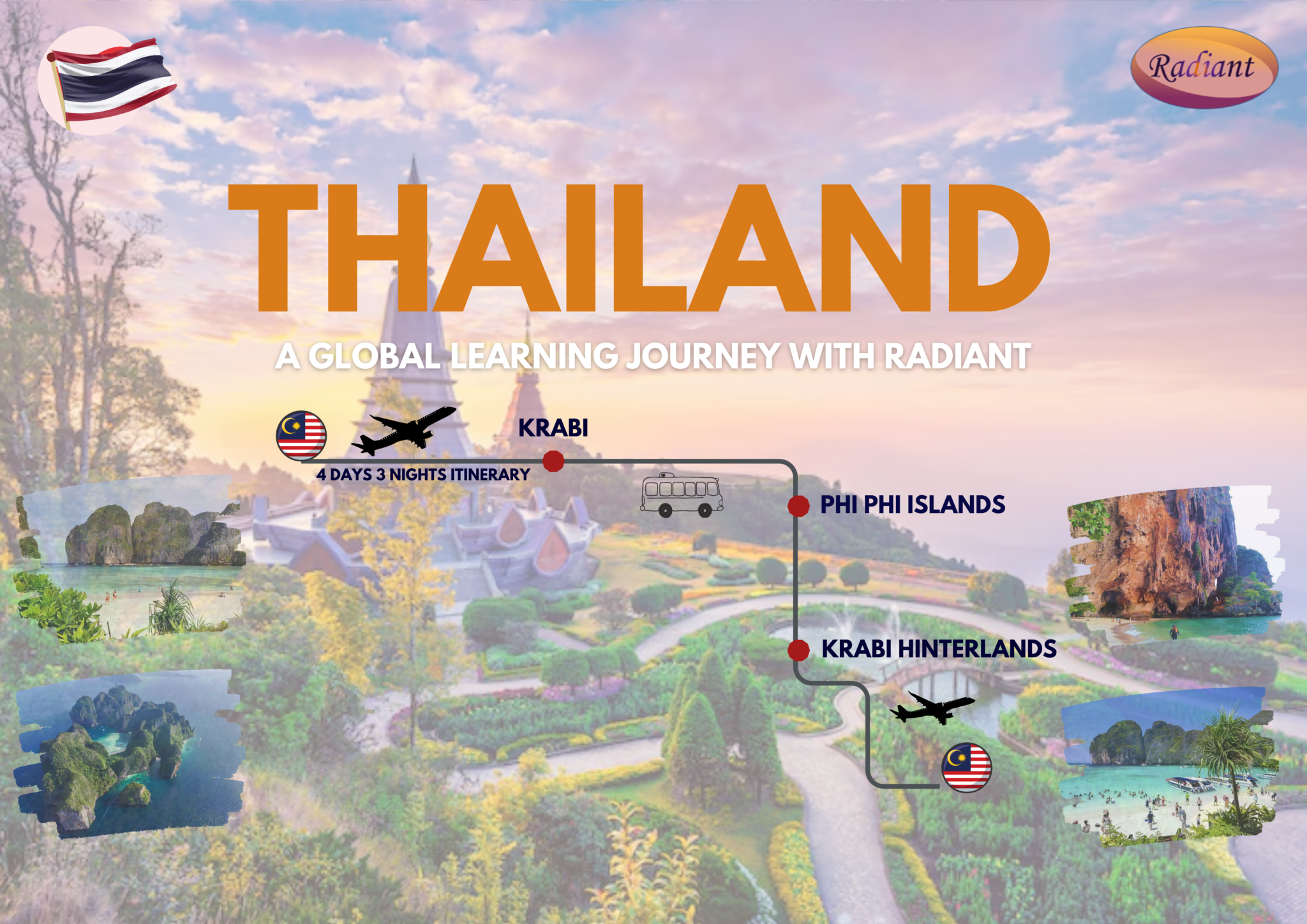Embark on an exciting educational adventure with Radiant to Thailand! Experience a specially curated 4-day 3-night journey filled with culture, nature, and exploration. Discover the beauty of Krabi, island-hop through the stunning Phi Phi Islands, and explore the scenic landscapes of the Krabi Hinterlands. Join us as we immerse in Thailand’s rich heritage, breathtaking coastlines, and unforgettable tropical experiences in one inspiring global learning journey.