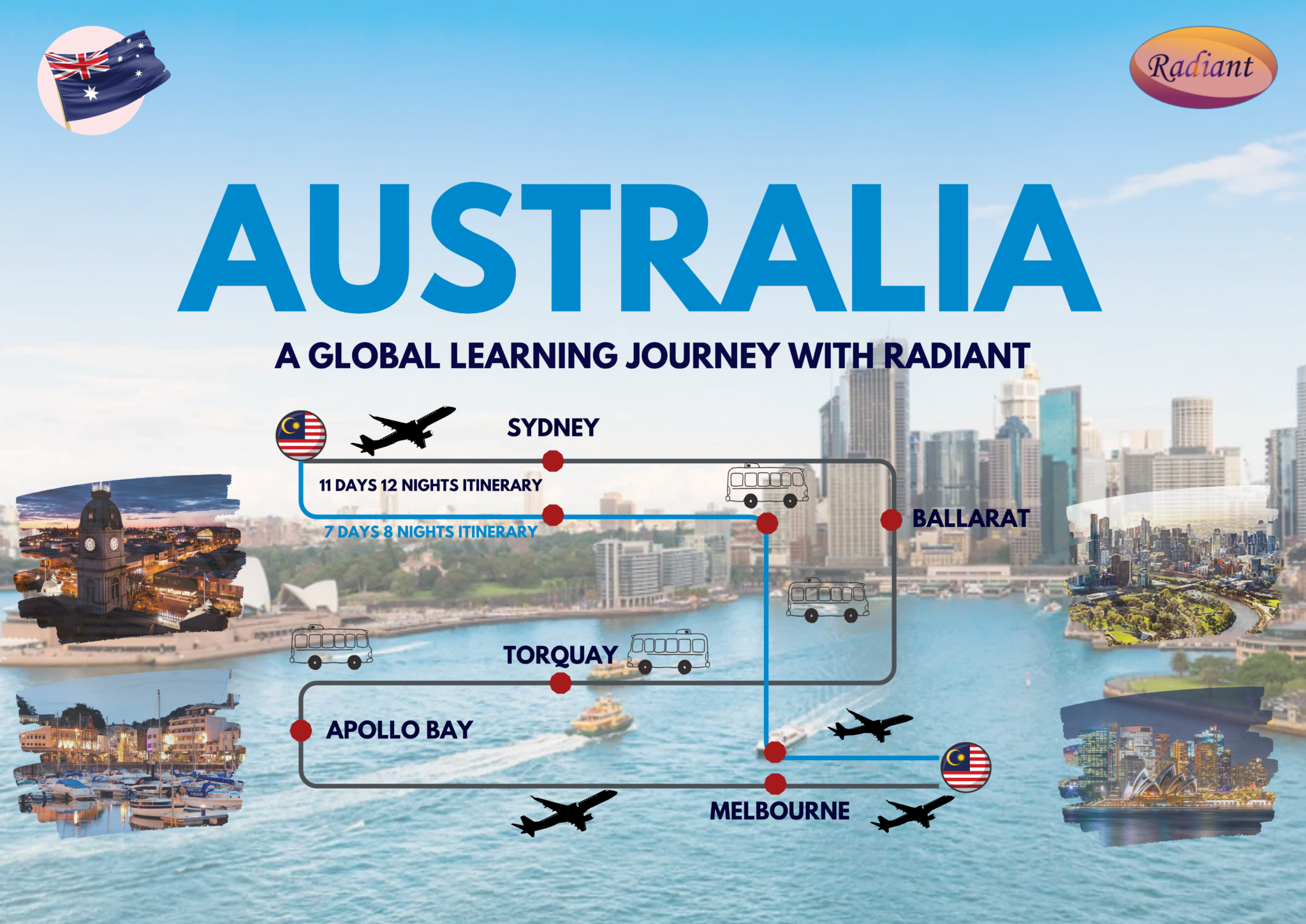 Embark on an unforgettable educational adventure with Radiant to Australia! Choose between two carefully curated itineraries: an immersive 11-day 12-night journey or a dynamic 7-day 8-night experience. Discover the vibrant city life of Sydney, explore the cultural charm of Melbourne, step back in time in historic Ballarat, and enjoy the scenic coastal beauty of Torquay and Apollo Bay. Join us as we explore Australia’s rich heritage, diverse culture, and breathtaking landscapes in one meaningful global learning journey.